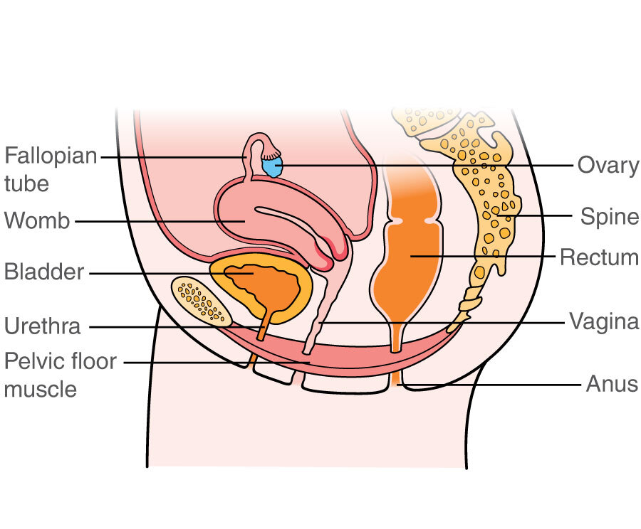 Where is the pelvis located on a woman. This area provides support for the intestines and also contains the bladder and. The urethra vagina and anus.